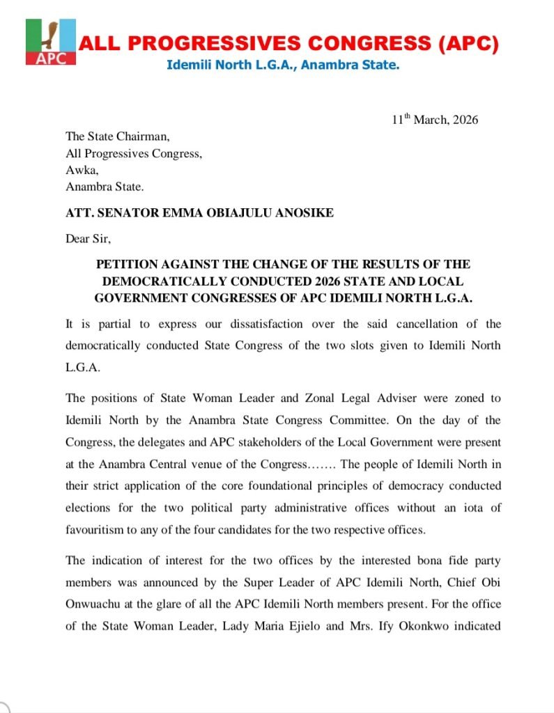 “It is therefore unfathomable to be informed that the results of the congress could be altered to favour individuals who neither participated meaningfully in the process nor demonstrated commitment to the party’s growth in Idemili North,” the statement read.The