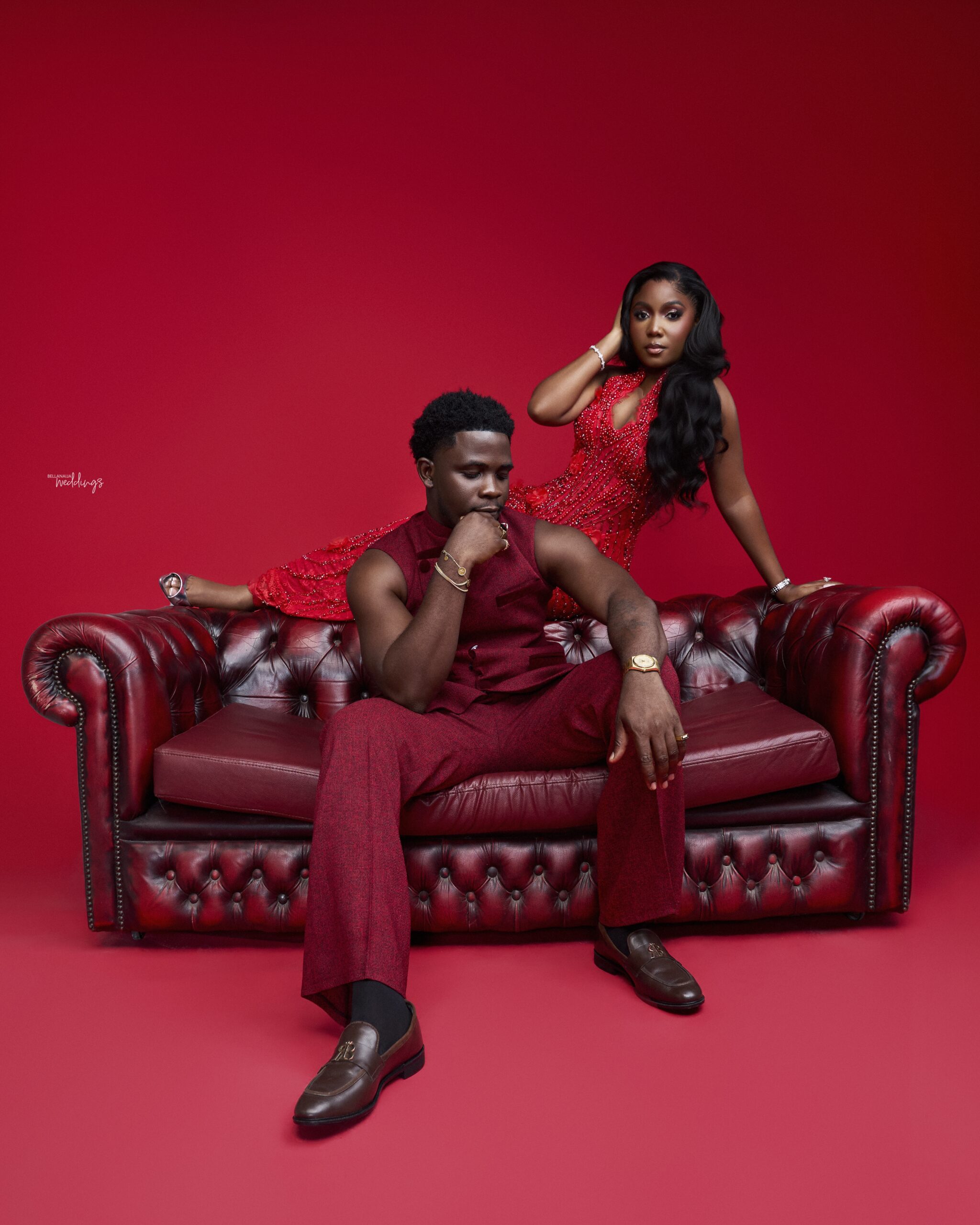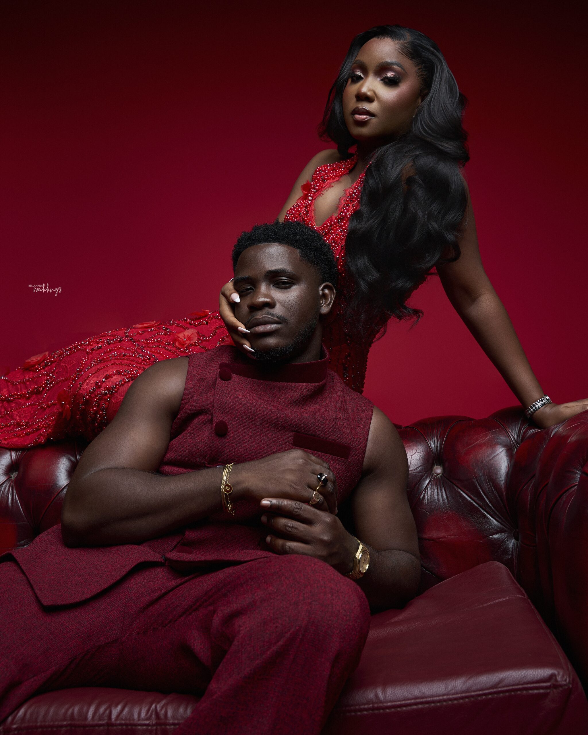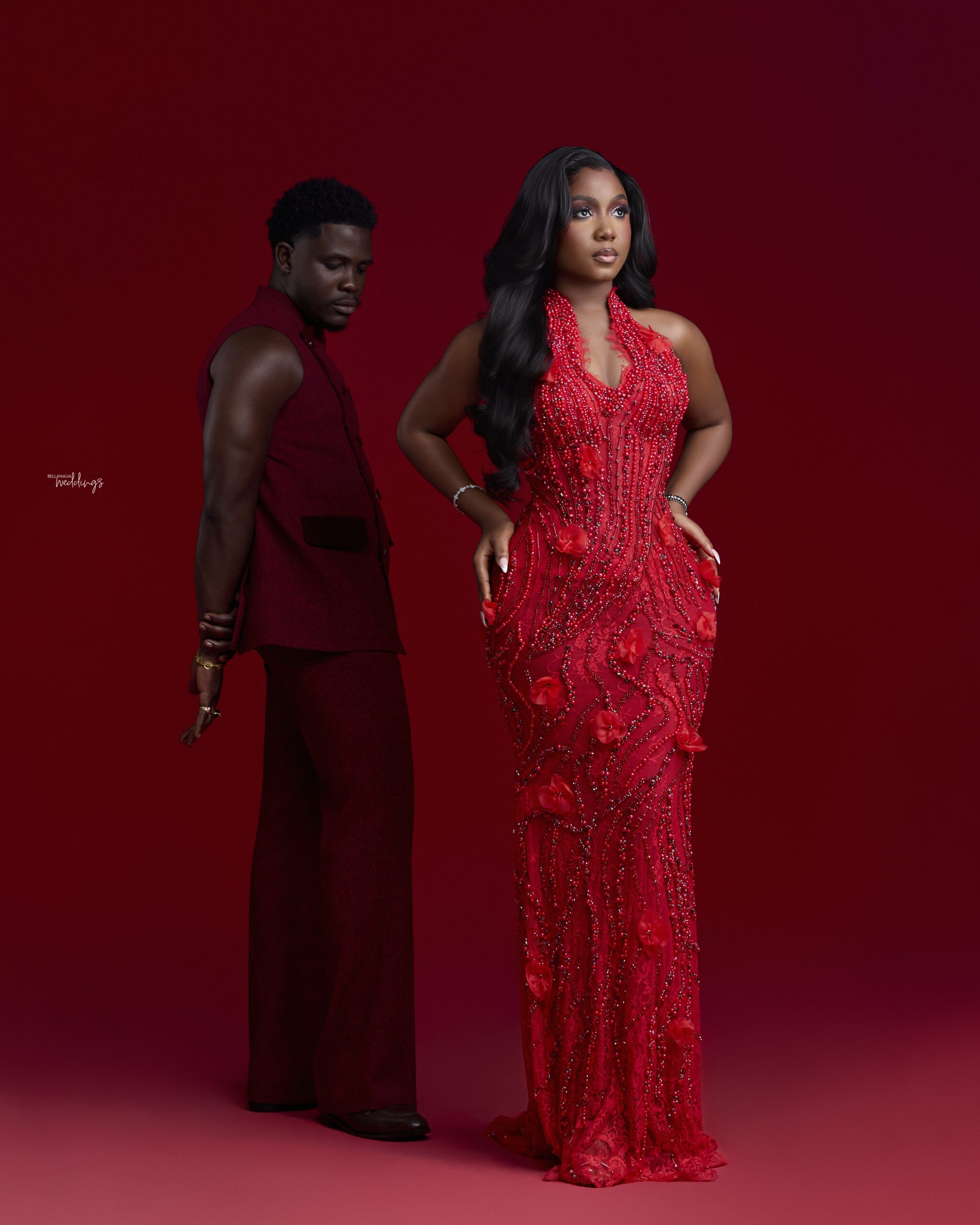 Let’s have a standing ovation for how gorgeous this red beaded look is on Simi and for Femi’s equally dapper style in this armless suit, so fabulous! Everything about these steamy photos is flawless; the chemistry is incredibly electric, and their style is top-notch. Their first pre-wedding photos were just as mesmerising, and we are so excited for the three more looks they have on the way! They are an undeniably perfect duo, and we wouldn’t have it any other way. 😍