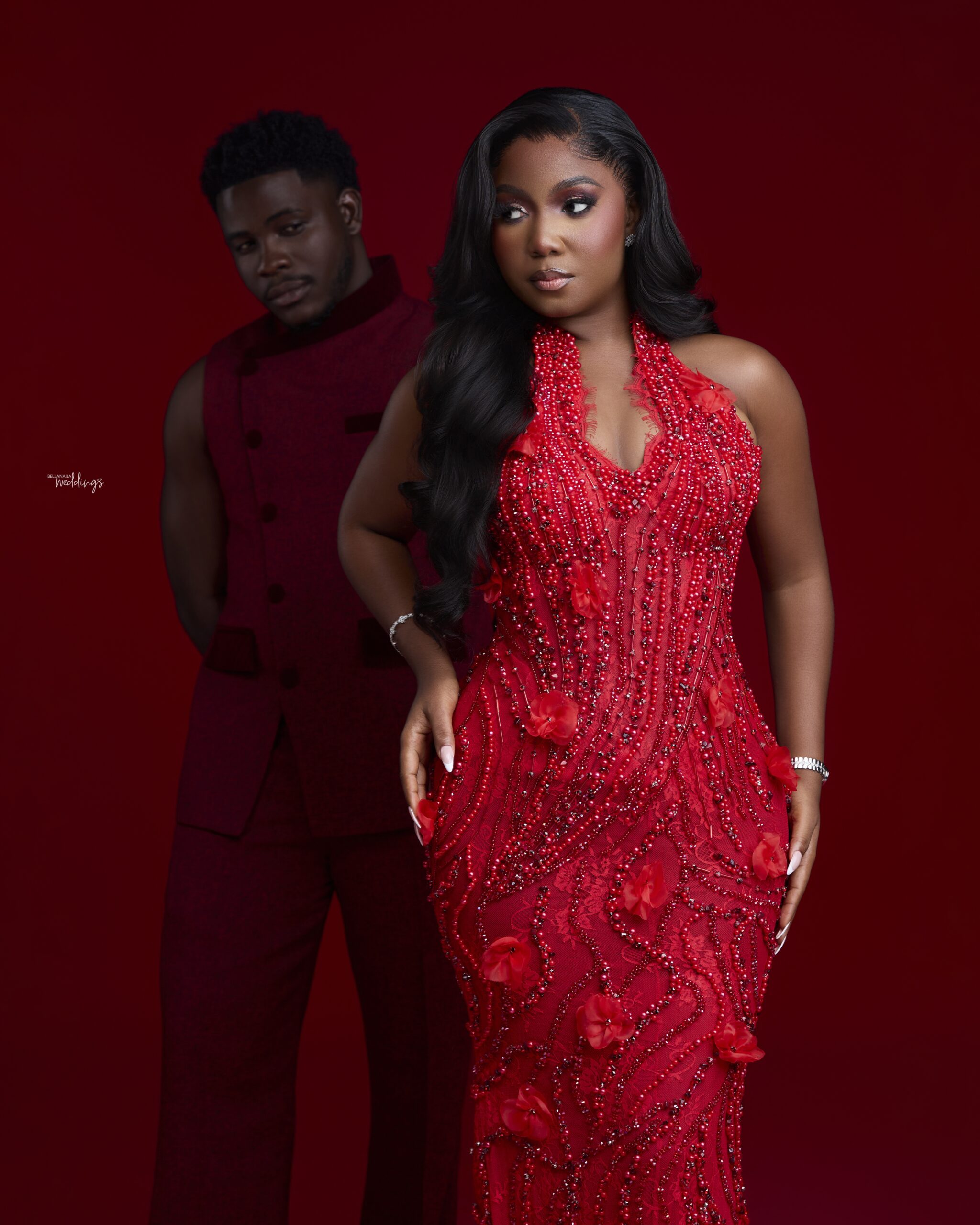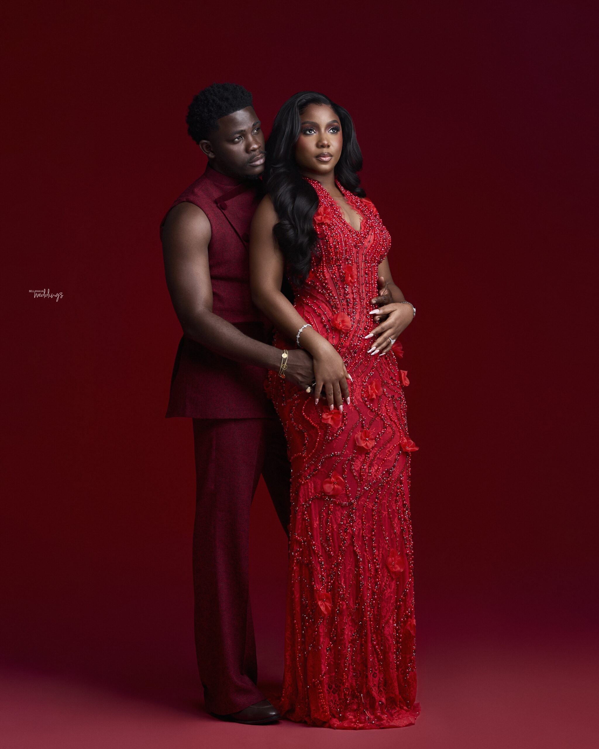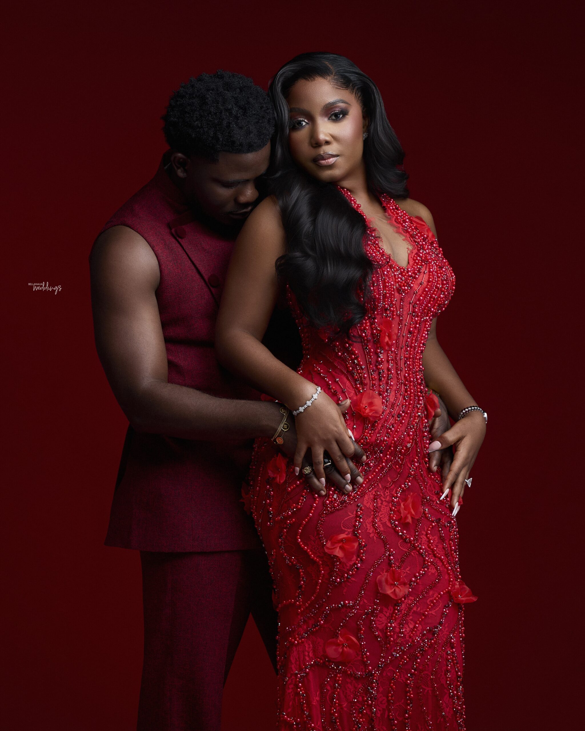 Let’s have a standing ovation for how gorgeous this red beaded look is on Simi and for Femi’s equally dapper style in this armless suit, so fabulous! Everything about these steamy photos is flawless; the chemistry is incredibly electric, and their style is top-notch. Their first pre-wedding photos were just as mesmerising, and we are so excited for the three more looks they have on the way! They are an undeniably perfect duo, and we wouldn’t have it any other way. 😍